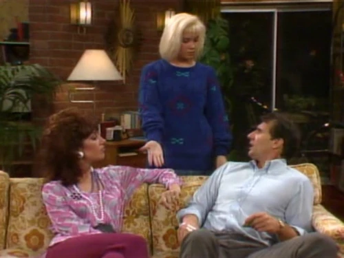Peggy Bundy is sitting at the kitchen table clipping coupons, when Kelly Bundy crosses the kitchen and sits down on the couch in the living room to do her homework. Behind her her brother Bud Bundy jumps out of a pot plant, grabs her hair, pulls her head back, and draws a rubber knife across her throat, saying "Die, commie bimbo!" Peggy looks at them and tells Bud to cut it out and that no one likes it nor thinks it's funny. She then tells them to go to school and they leave.